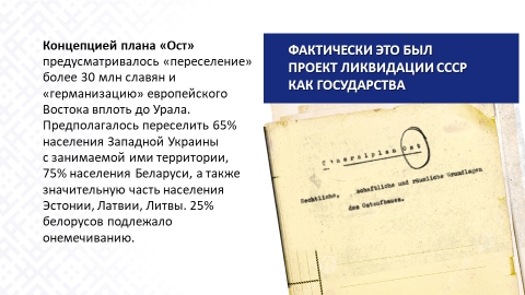 Планы нацистов были зловещи. Генеральный план «Ост» – план колонизации и германизации оккупированных земель Восточной Европы – устанавливал на захваченных территориях так называемый «новый порядок». Он был направлен на физическое уничтожение как населения, так и государственного строя.