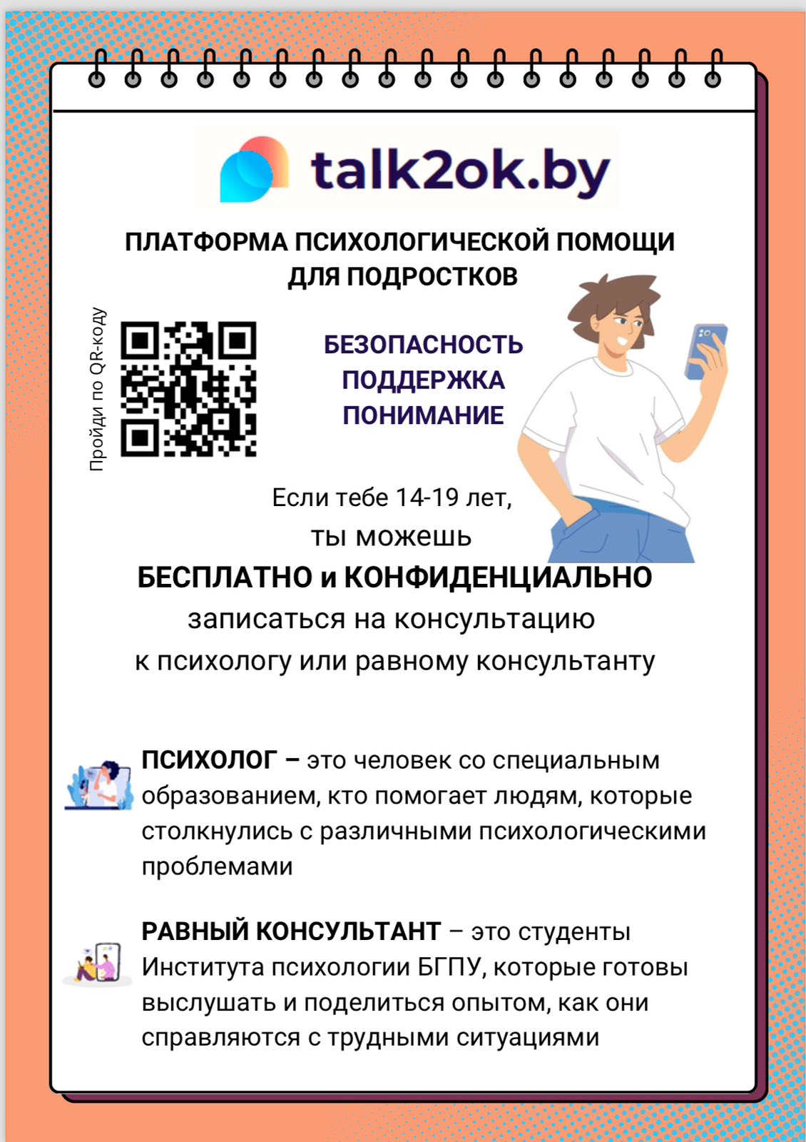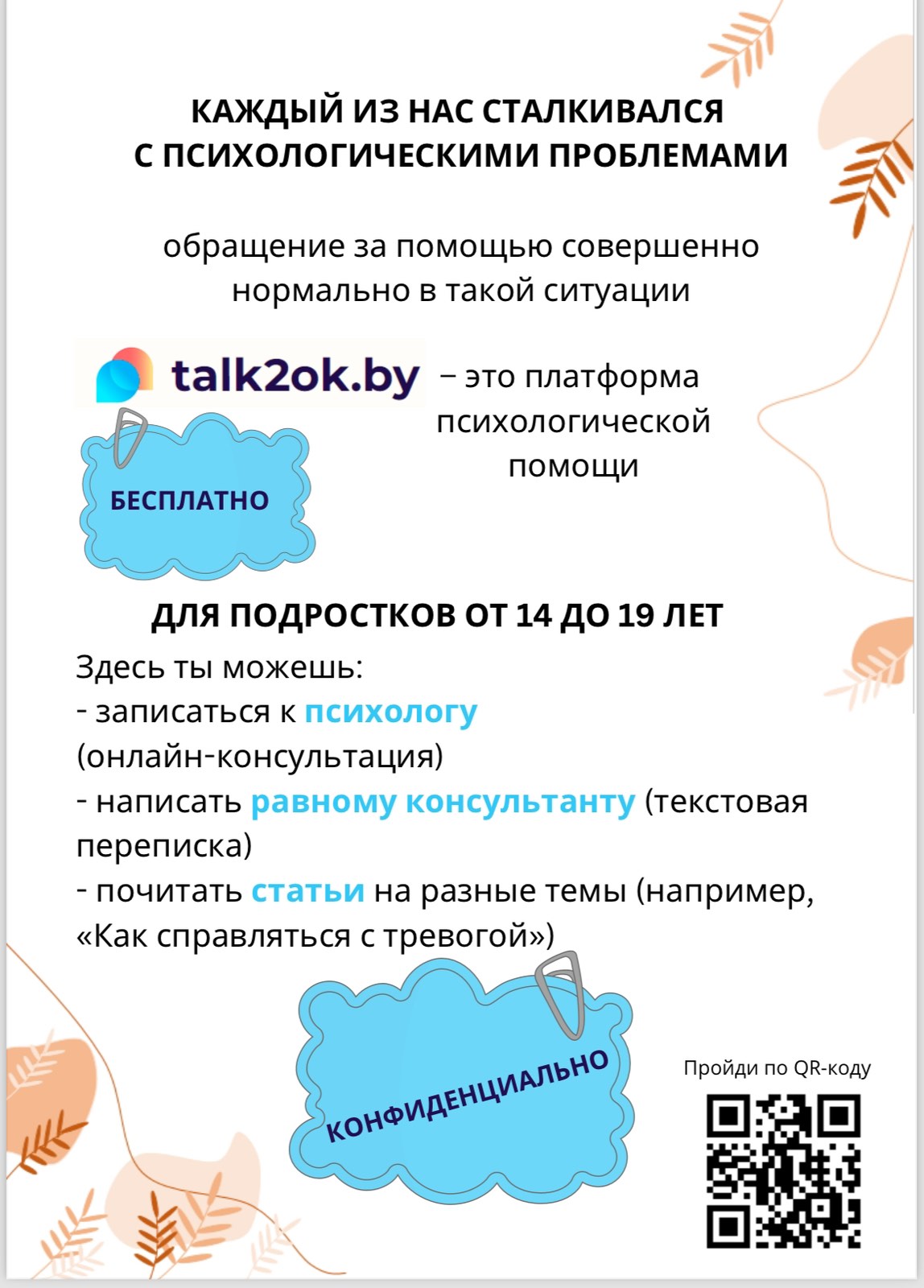 В целях расширения возможностей получения своевременной и доступной консультативной психологической помощи и поддержки для подростков в возрасте от 14 до 19 лет, в том числе и в кризисных ситуациях, следствием которых могут стать самоповреждающее, суицидальное поведение, просим довести до заинтересованных лиц информацию о деятельности платформы https://talk2ok.by